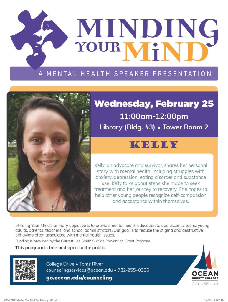 On February 25th at 11:00 a.m. – Join the Counseling Center in the Library (Building 3, Room 123) for Minding Your Mind, featuring Kelly, an advocate and survivor. Kelly will share her story of navigating anxiety, depression, an eating disorder, and substance use, and the steps she took toward treatment and recovery. To RSVP, email Kelly Petrolis at kpetrolis@ocean.edu.