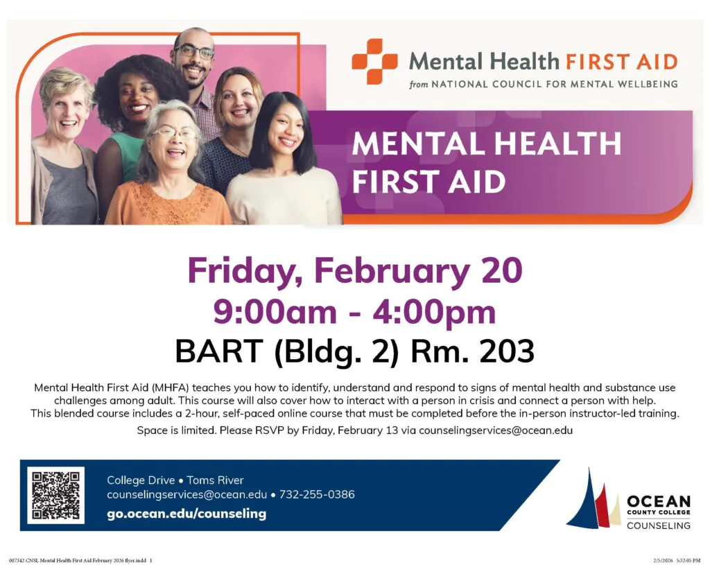 Join us for a Mental Health First Aid training! Learn how to identify, understand, and respond to signs of mental health and substance use challenges in adults. You’ll also learn how to support someone in crisis and connect them with the right help. This course includes a 2-hour, self-paced online session that must be completed before attending the in-person, instructor-led training. To RSVP, email counselingservices@ocean.edu.