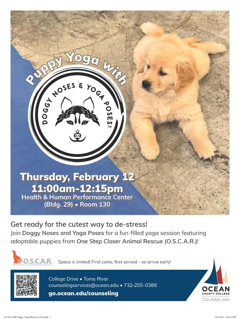 On February 12th at 11:00 a.m., unwind with Puppy Yoga in the Health and Human Performance Center (Building 29, Room 130). Hosted in collaboration with the Counseling Center, Doggy Noses and Yoga Poses, and a local animal rescue, this relaxing wellness event will combine gentle yoga with the joy of cuddling adoptable rescue puppies. For more details, contact the Counseling Center at counselingservices@ocean.edu.